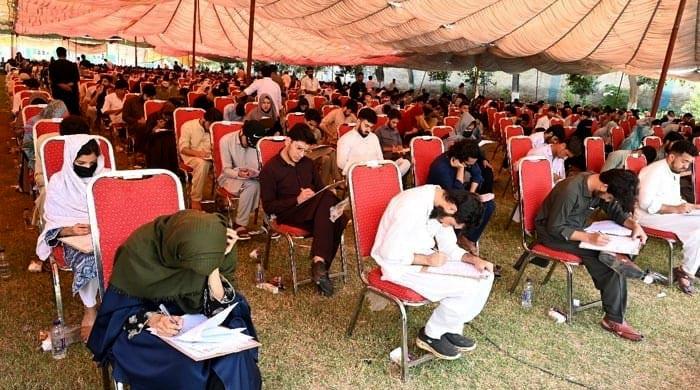 This image shows students attempting the MDCAT exam on September 22, 2024. — X@kmuofficial_